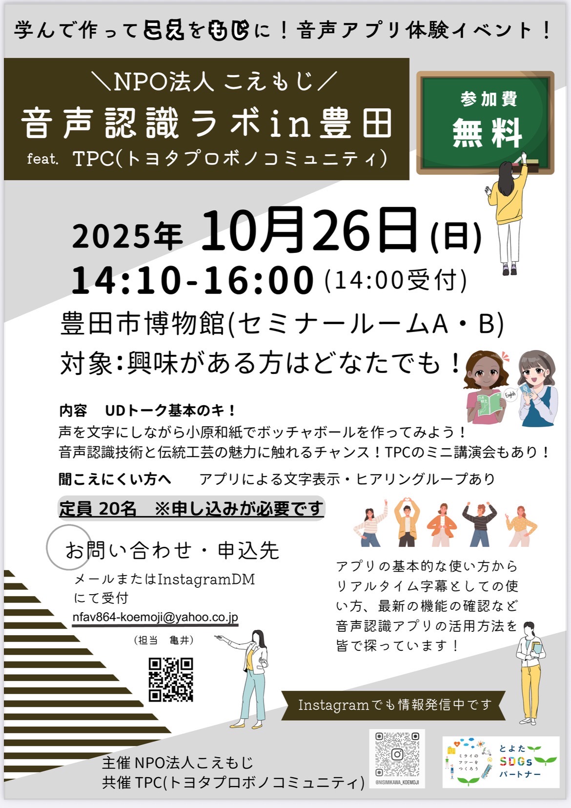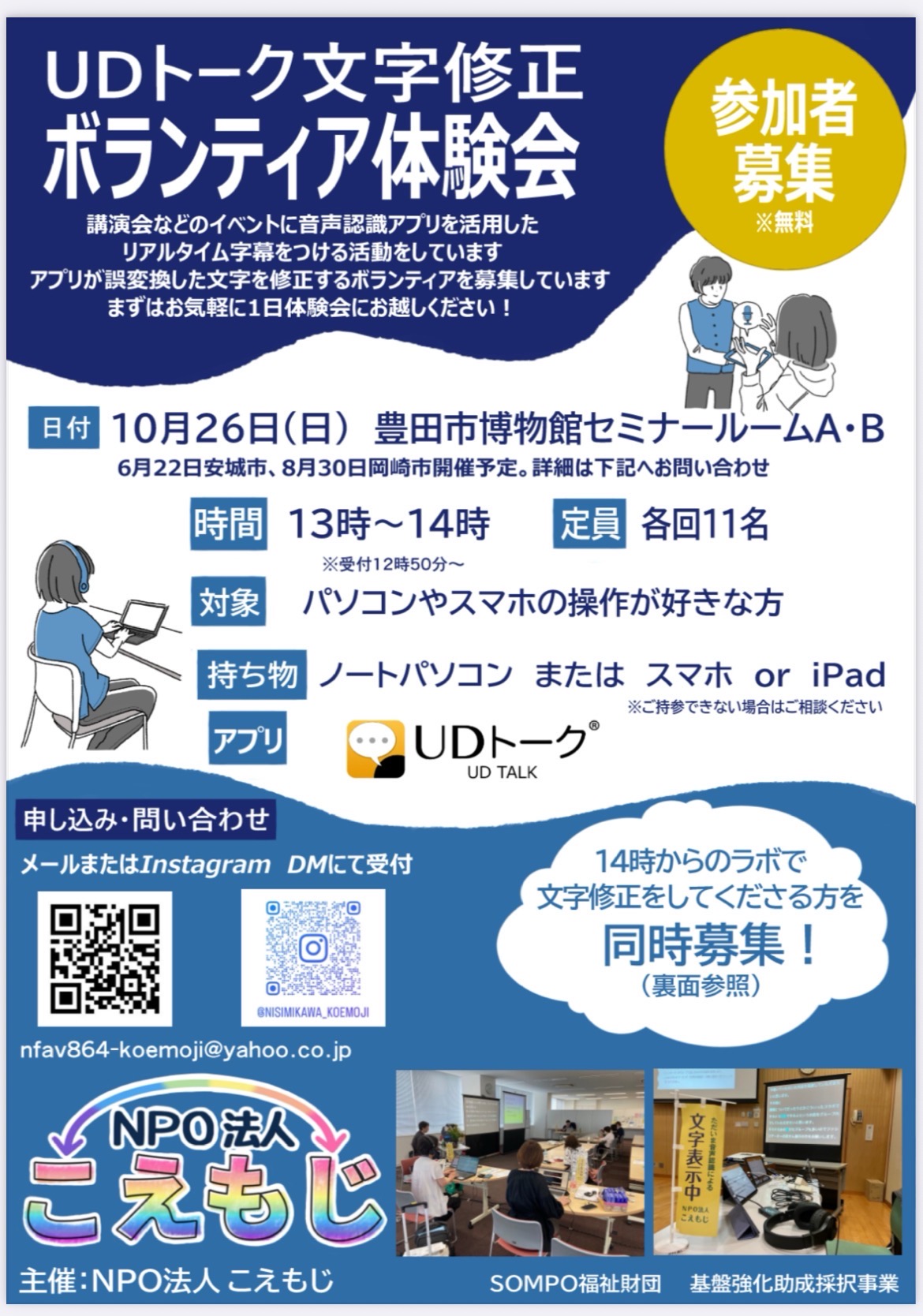 開催時間 | 14:10~16:00 ※13:00~14:00までは、 UDトーク文字修正体験を実施しています。 |