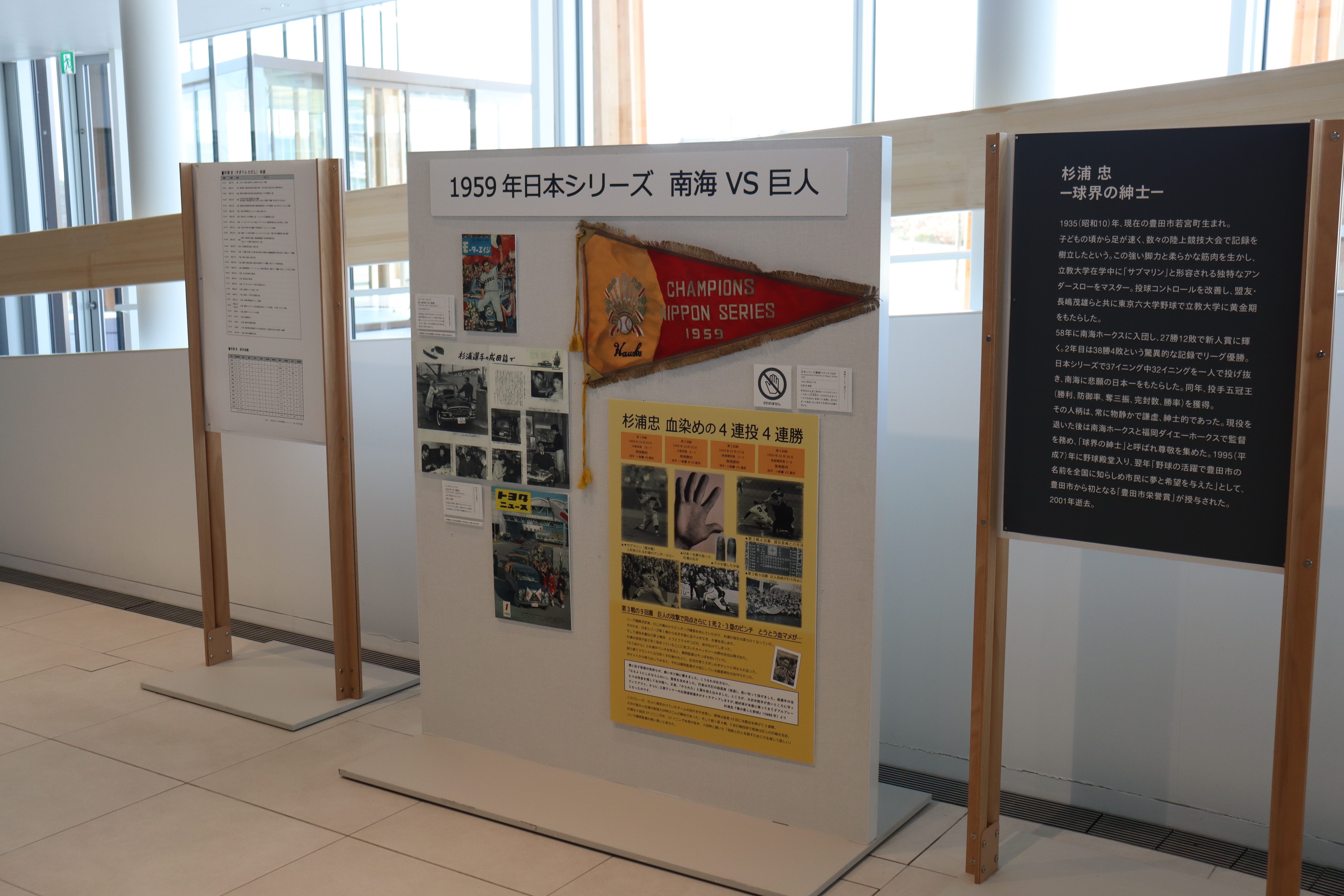 1936(昭和11)年に日本職業野球連盟が発足して今年で90年を迎えます。日本のプロ野球の歴史の中で選手たちの活躍は人々に感動を届けてきました。今回、1940年代から1960年代にかけて活躍した市域出身の杉山悟と杉浦忠の2人の選手を取り上げ、ゆかりの品々からその活躍と魅力を紹介します。