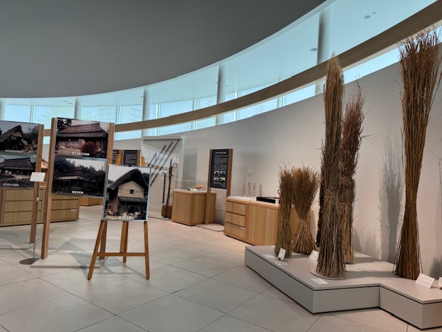 とよたストーリーでは「とよたの茅-茅葺き民家と茅利用-」と題して、市域を中心とした茅葺きや茅利用の歴史・文化を紹介しています。100年前の茅葺き屋根から発見された植物の標本や実際に茅葺きに使用される道具類など、茅に関する様々な資料を展示しています。展示を見たあとは、庭園内の「むかしの家」で本物の茅葺き屋根の家屋を体験してみてください。